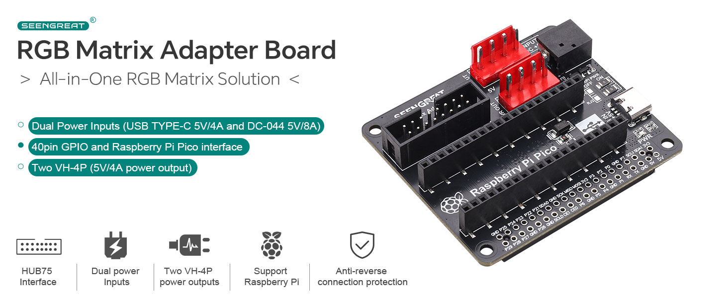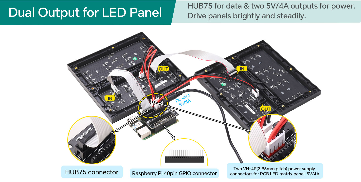 Dual Outputs:Two dedicated VH-4P connectors deliver stable 5V/4A power directly to your LED panel, preventing voltage drop.A set of 40pin GPIO connectors for motherboards of Raspberry Pi series