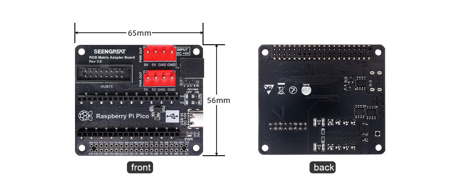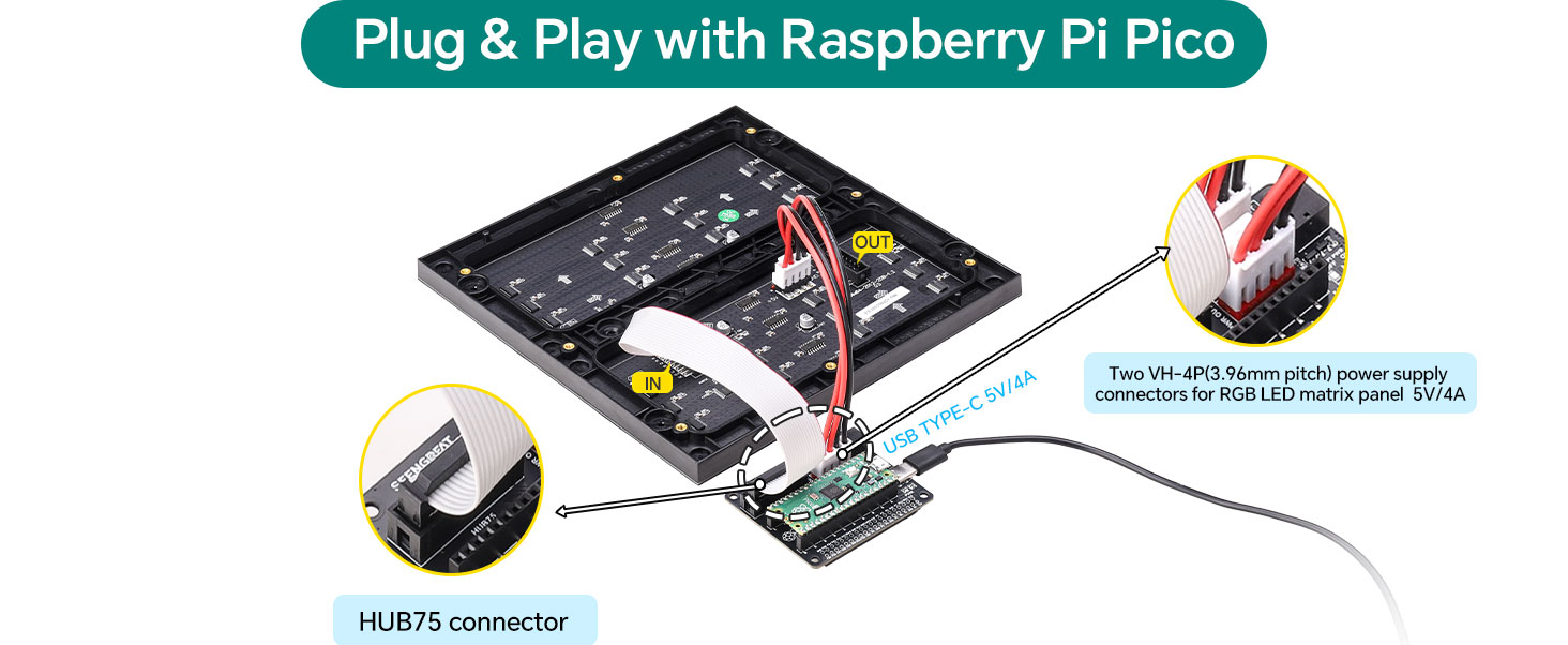 - Two VH-4P(3.96mm pitch) power supply connectors for RGB LED matrix panel