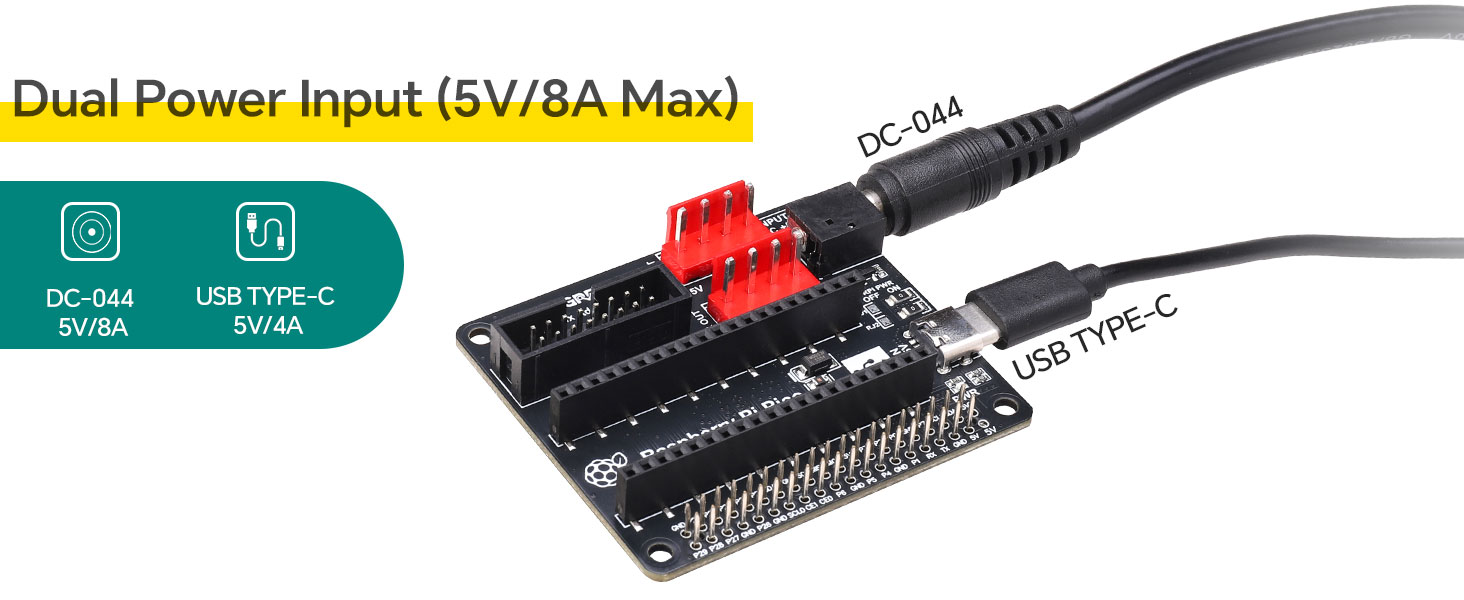 Dual Inputs: Use either a USB-C cable or a DC-044 jack (5V/8A max) for flexibility.