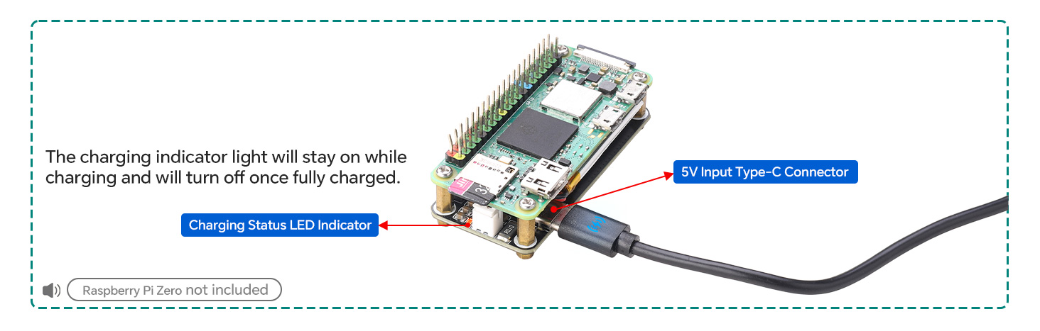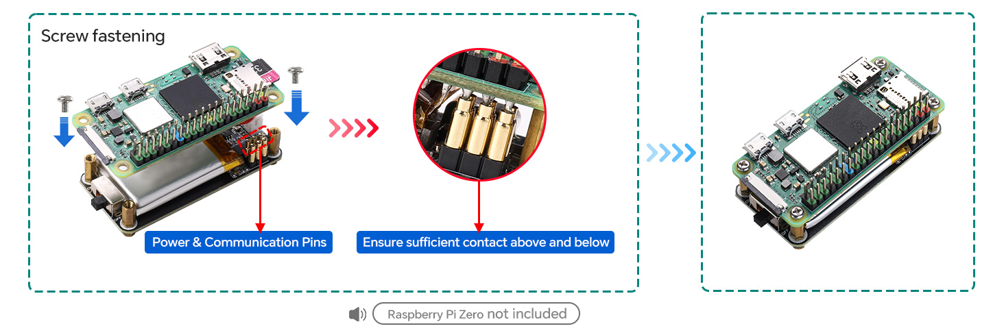 Connect battery → Install to Pi Zero → Connect Type-C power → Turn on switch → Ready to use