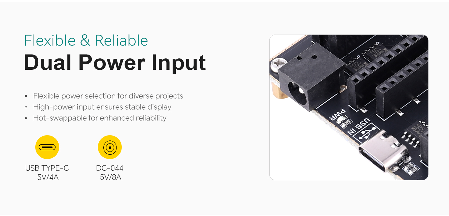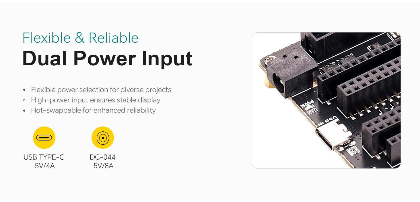 · Dual power input ports: USB Type-C 5V/4A or DC-044 5V/8A