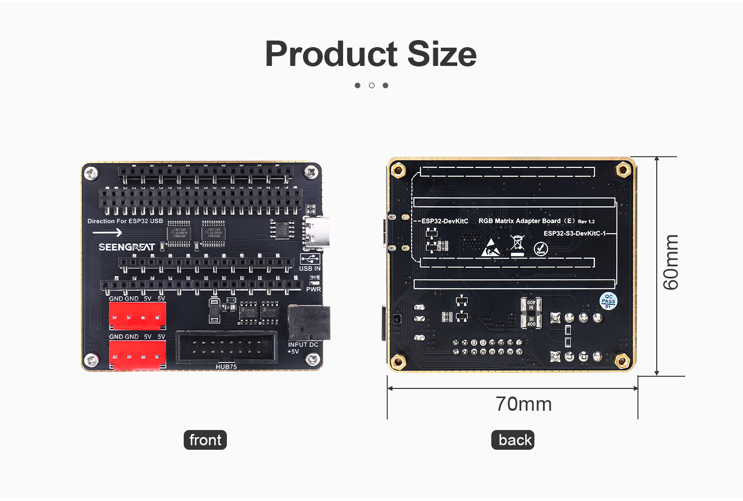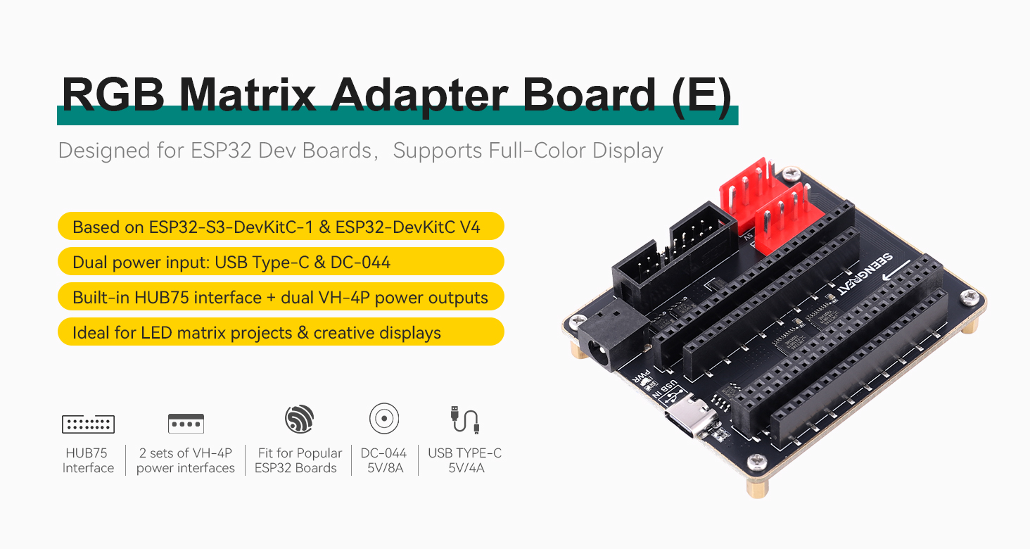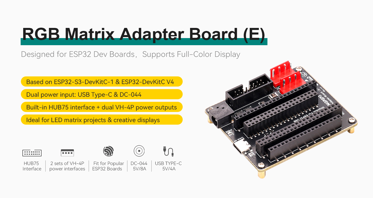 The RGB Matrix Adapter Board (E) is designed based on the ESP32-S3-DevKitC-1 and ESP32-DevKitC V4 development boards. It is specifically built for efficient data transmission and stable power management. This board is suitable for displaying text, graphics, animations, and more, helping users quickly bring various creative designs to life.