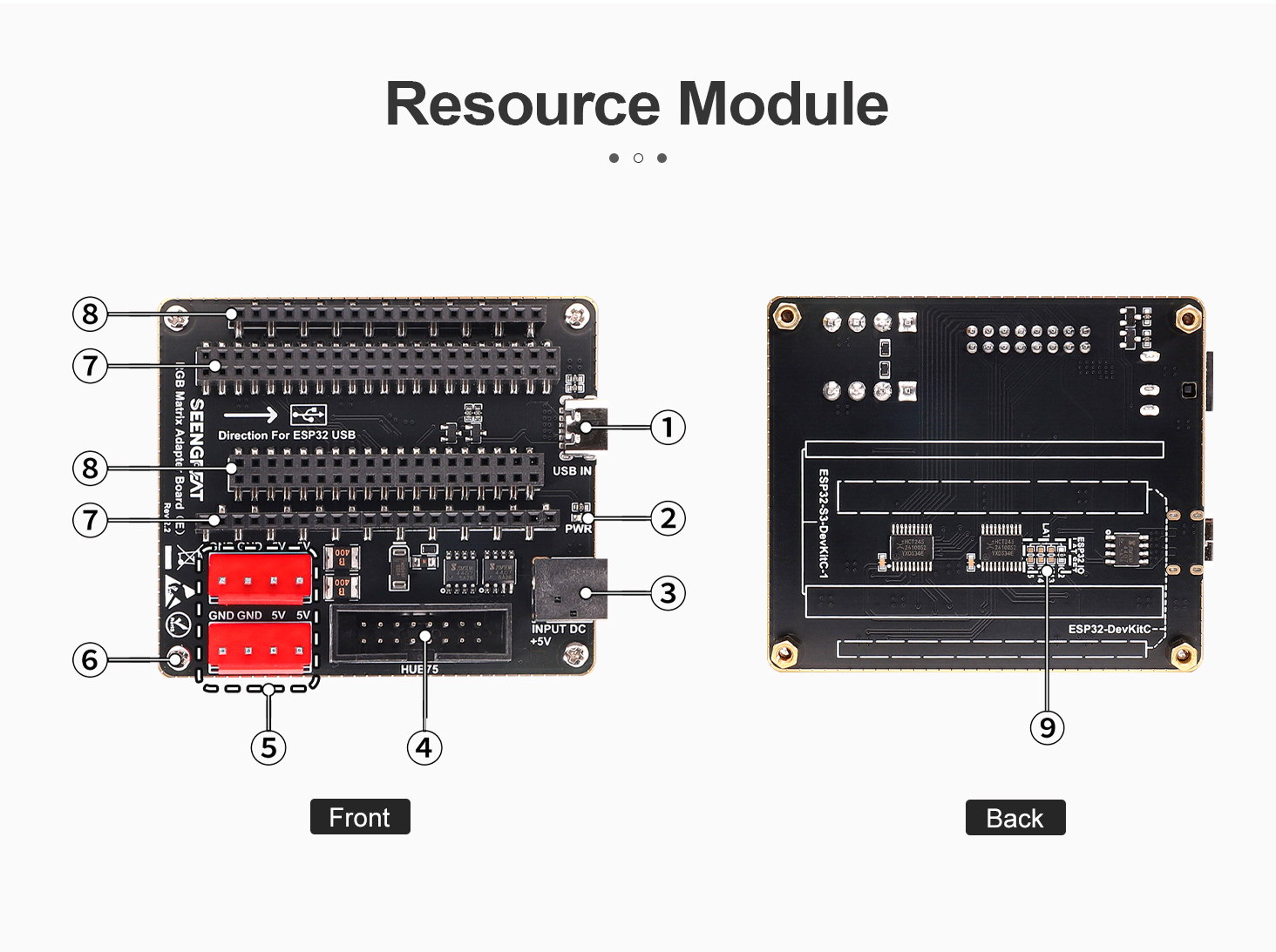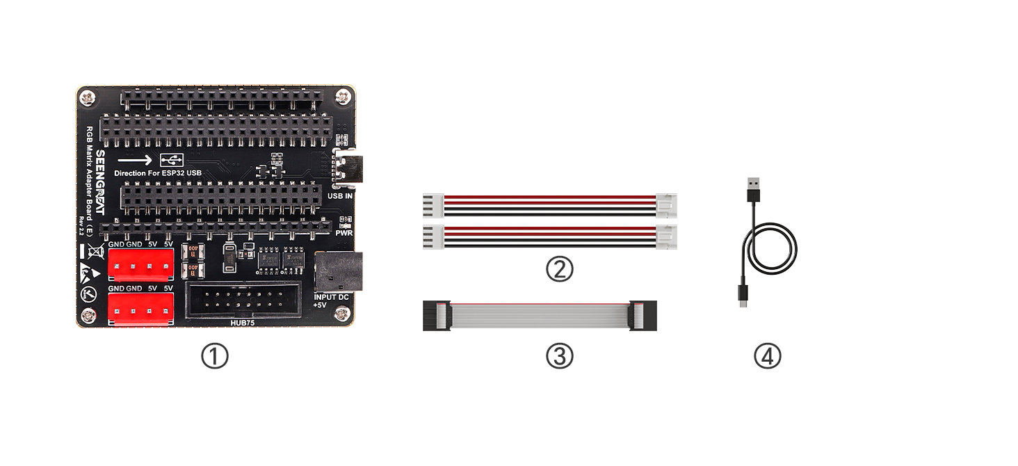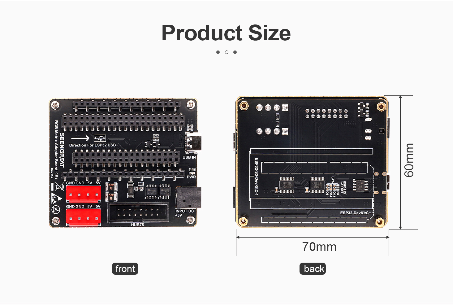 The RGB Matrix Adapter Board (E) is designed based on the ESP32-S3-DevKitC-1 and ESP32-DevKitC V4 development boards. It is specifically built for efficient data transmission and stable power management. This board is suitable for displaying text, graphics, animations, and more, helping users quickly bring various creative designs to life.