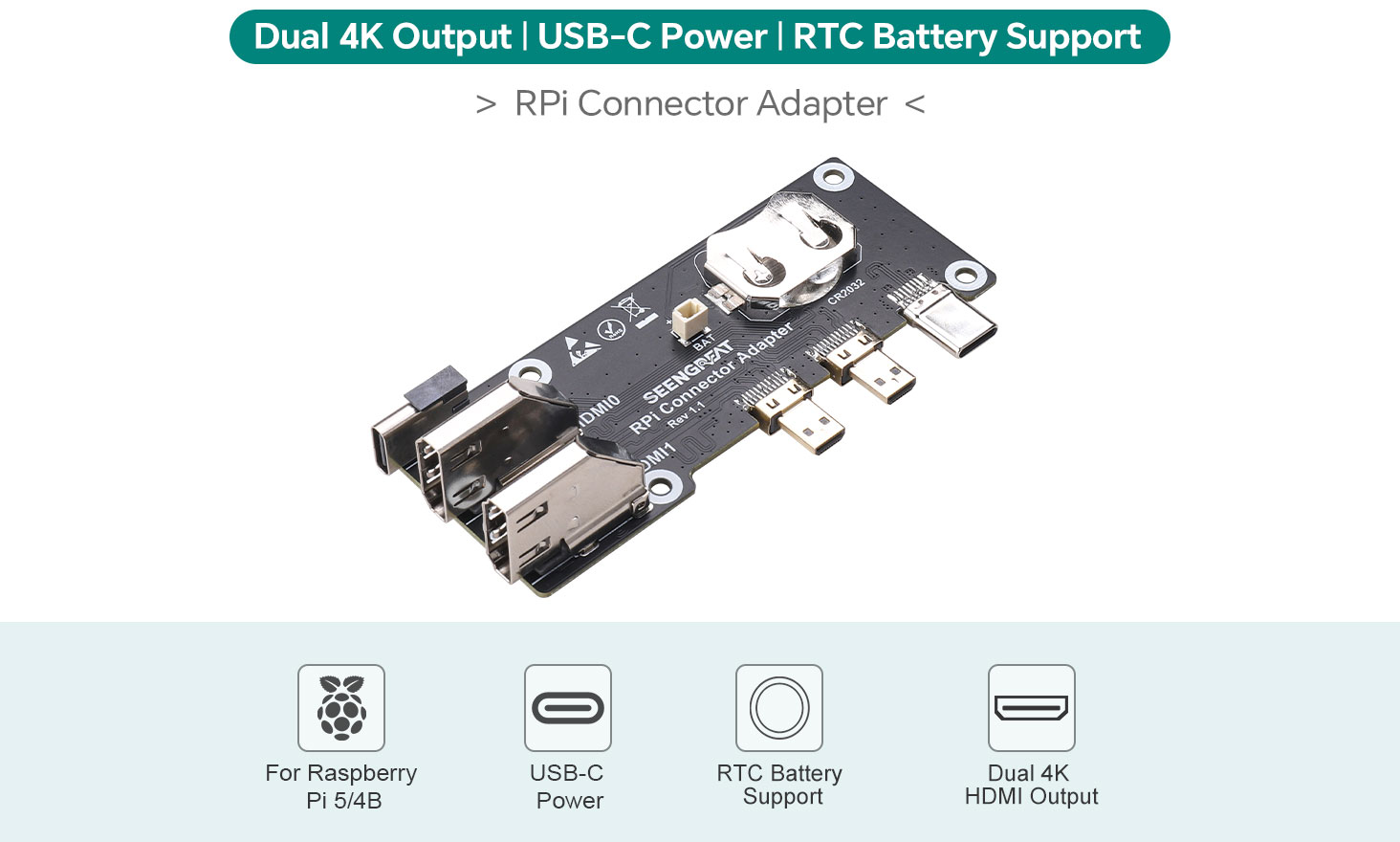 Micro HDMI to HDMI Adapter Compatible with Raspberry Pi 5/4B Easier Connection Supports Dual 4K Output RTC Battery Input