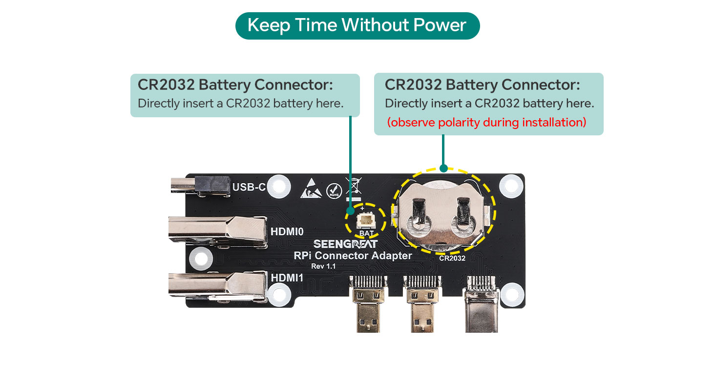 - Onboard CR2032 battery connector and included cable, convenient for connecting an RTC battery to the Raspberry Pi 5.