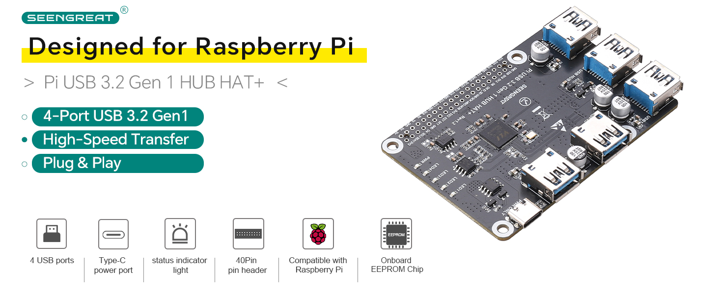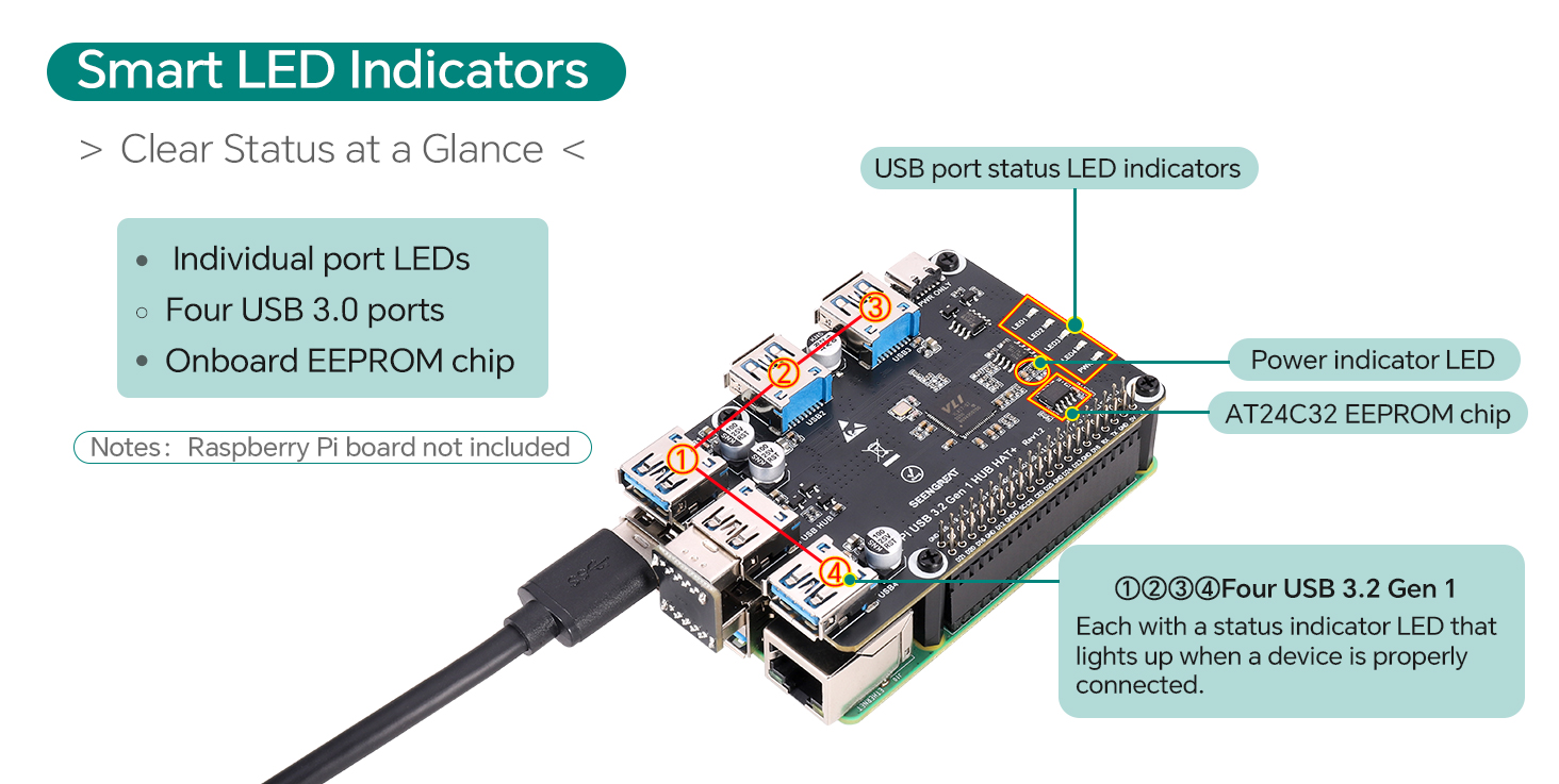 This USB 3.0 expansion board is specifically designed for Raspberry Pi. It allows you to easily connect more devices to your Raspberry Pi, enhancing your project capabilities. It features an onboard EEPROM chip and provides four USB 3.0 interfaces, enabling the connection of multiple peripherals and improving the connectivity and expandability of the Raspberry Pi. Moreover, it supports the high-speed transfer of USB 3.0, ensuring more stable and faster data transmission, perfectly solving the problem of insufficient USB ports on the Raspberry Pi itself. Whether you are using the Raspberry Pi for home entertainment, IoT projects, or personal development experiments, this expansion board provides additional USB ports, solves device connection problems, and enhances your Raspberry Pi experience. Simple installation, plug-and-play, powerful functionality, suitable for various needs, it is an essential expansion tool for every Raspberry Pi enthusiast.2. Product Features
