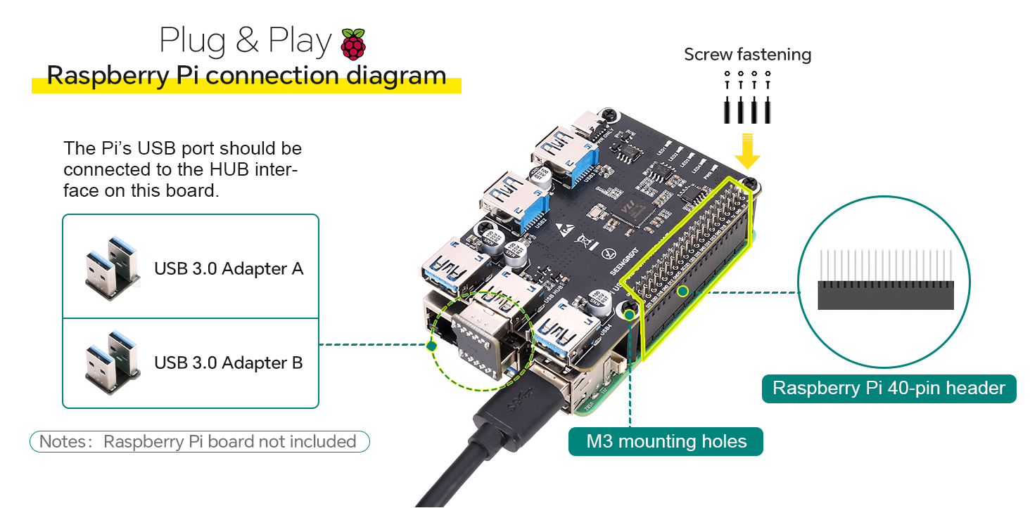 It supports USB 3.0 high-speed transmission, ensuring faster and more stable data transfer, and effectively resolves the limitation of the Pi's limited built-in USB ports.