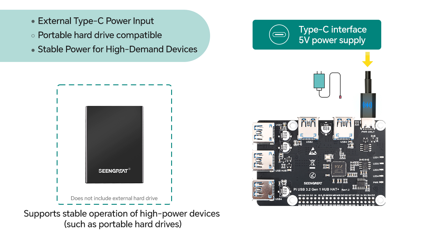 Onboard Type-C external power input (5 V DC) to ensure stable power supply when multiple high-current devices are connected.