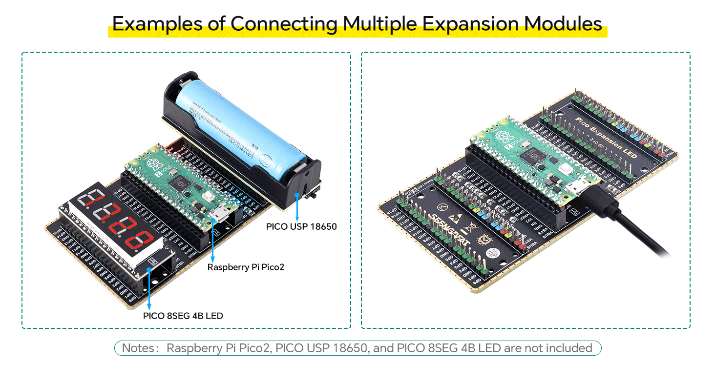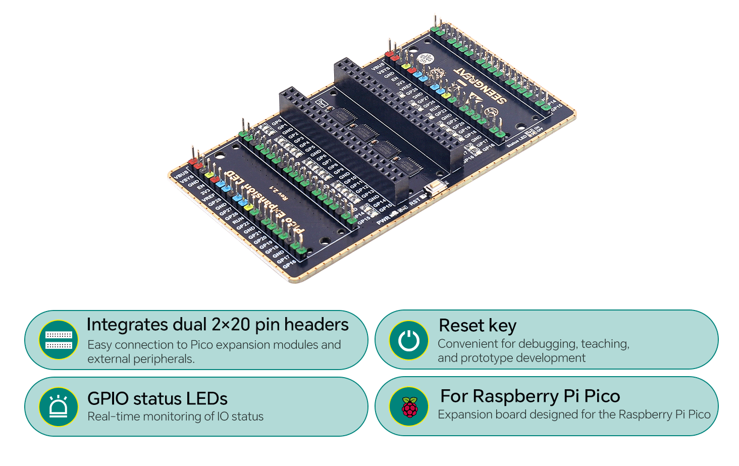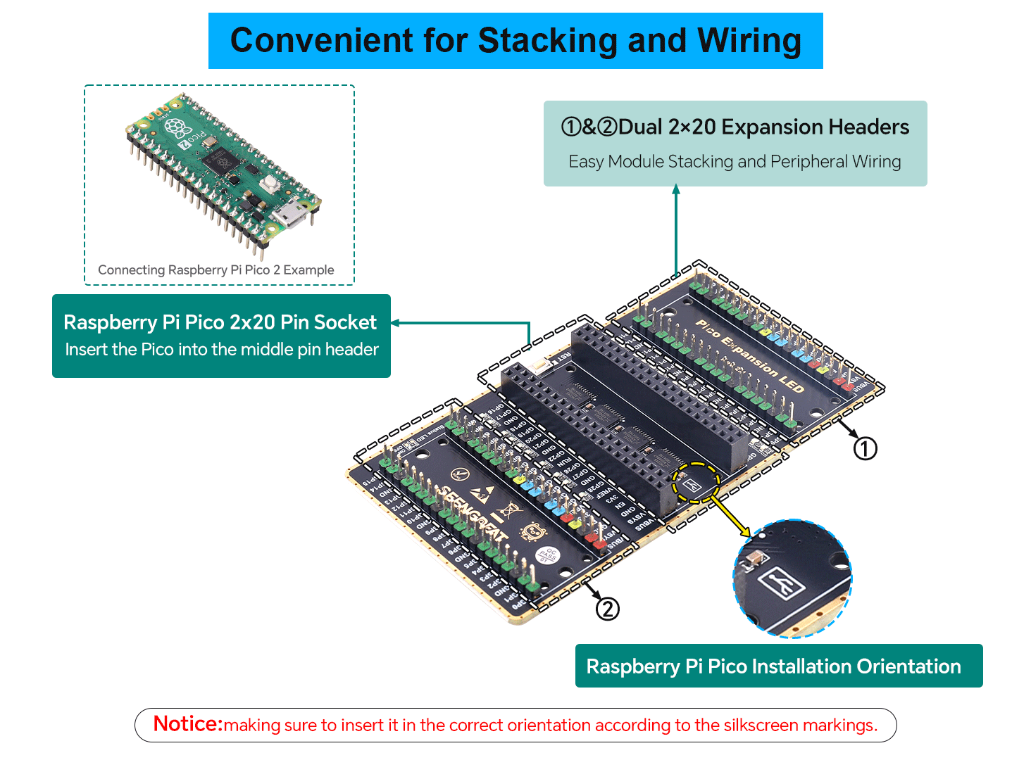 Two sets of 2×20 headers while keeping full access to Pico pins.Stack additional Pico expansion boards or connect peripherals via Dupont wires.Suitable for breadboard experiments, module integration, and rapid prototyping.
