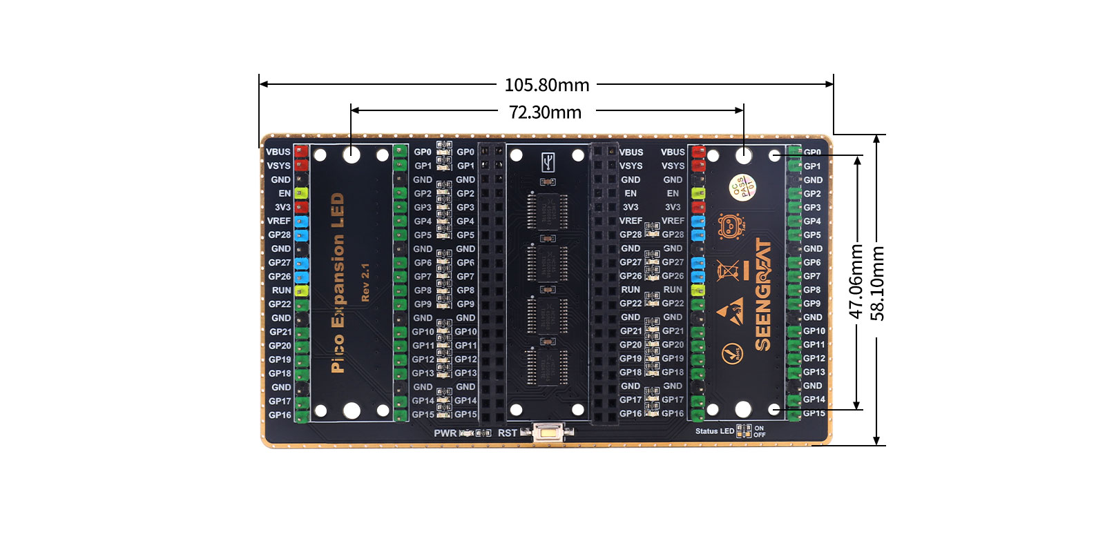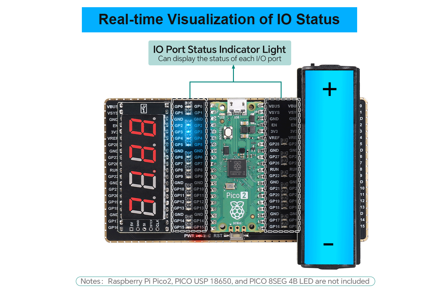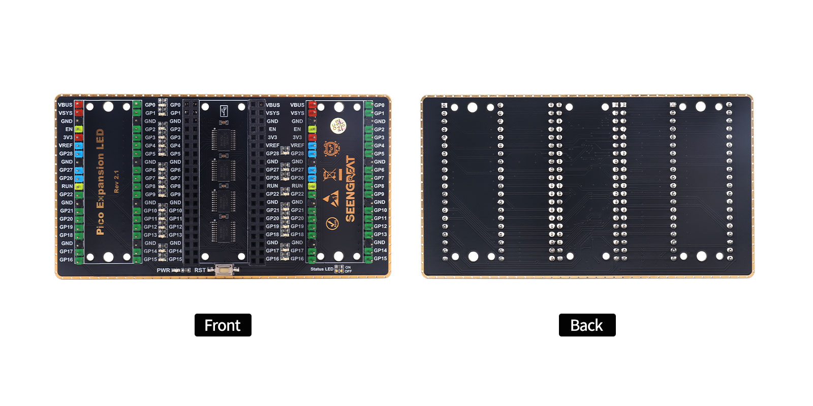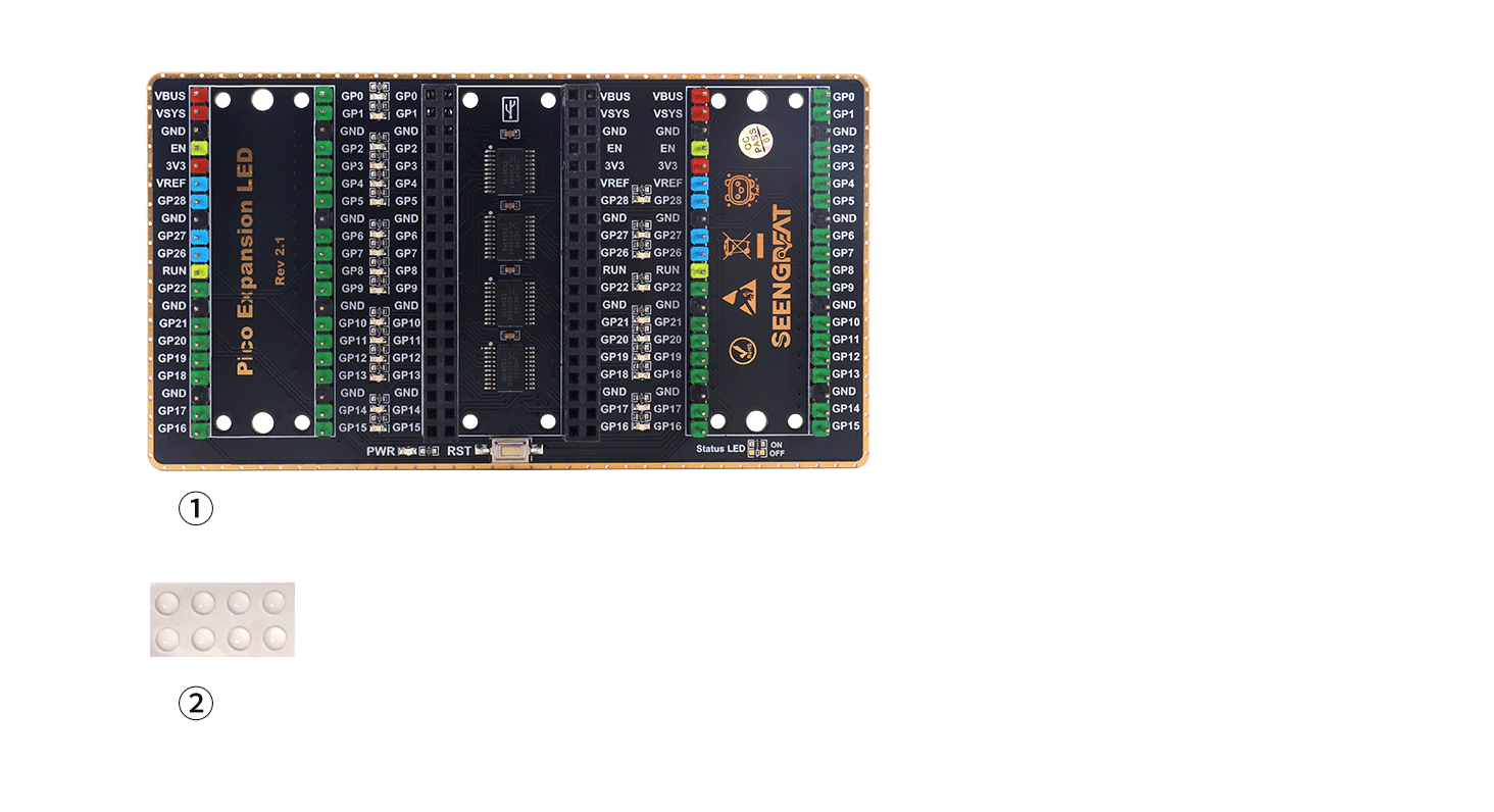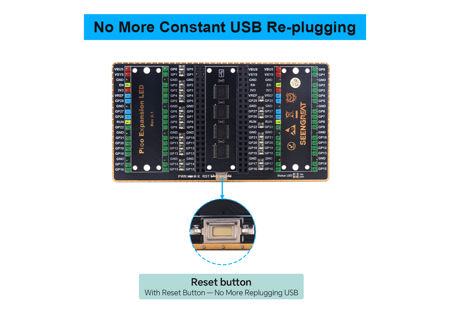 Since the Raspberry Pi Pico itself does not include an onboard reset button, this expansion board adds a dedicated reset key. This allows users to reset the Pico during debugging or programming without repeatedly unplugging and re-plugging the USB cable.