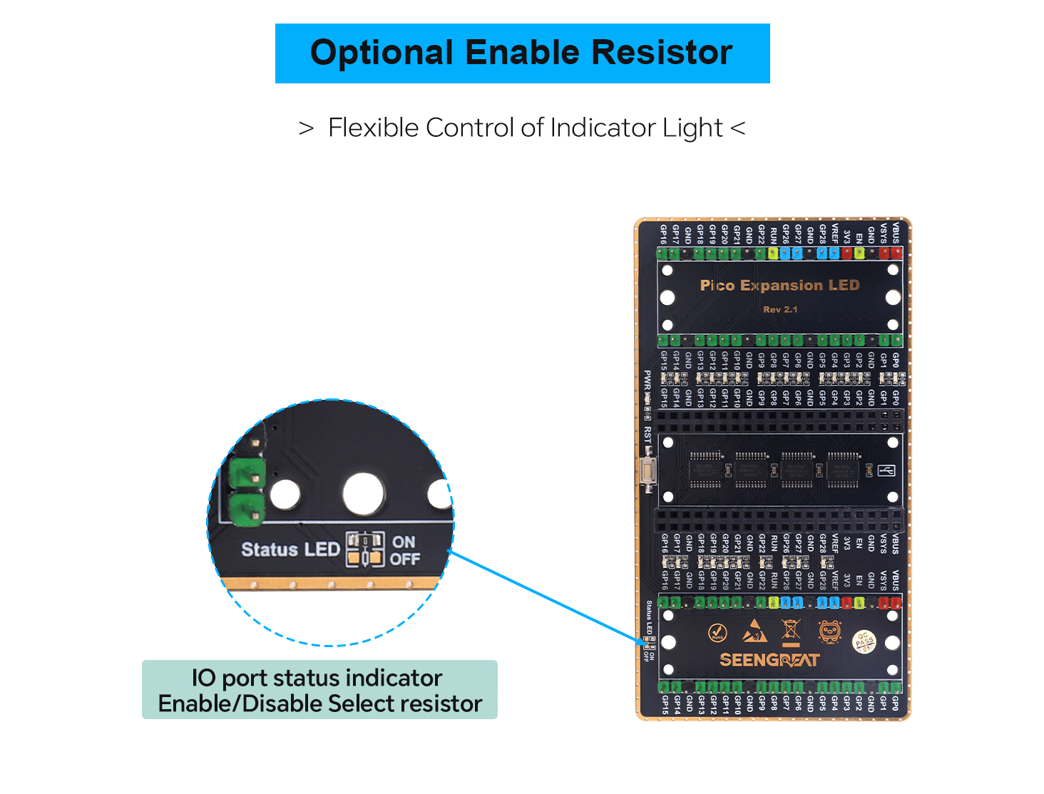 On-board selection resistors allow IO status LEDs to be enabled or disabled.Balances visual debugging with power consumption and signal integrity.Suitable for low-power or noise-sensitive application scenarios.