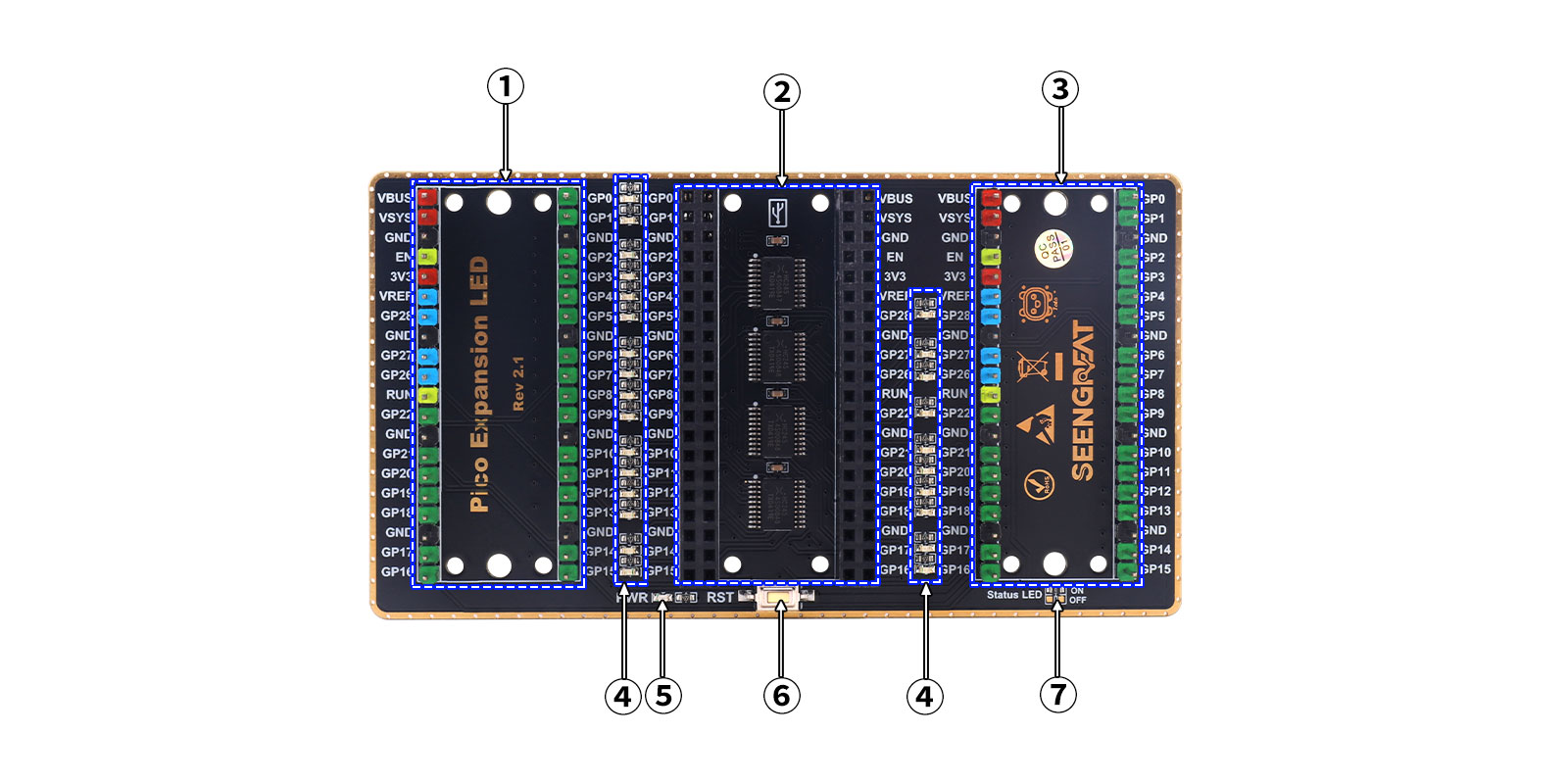 The Pico Expansion LED is an extension board designed for the Raspberry Pi Pico. It provides two sets of 2×20 external expansion pin headers, a reset button, and IO status indicator LEDs. The dual 2×20-pin headers make it easy to connect Pico expansion modules or link Dupont wires to external peripherals, while the IO status LEDs display the logic status of each IO pin in real time.