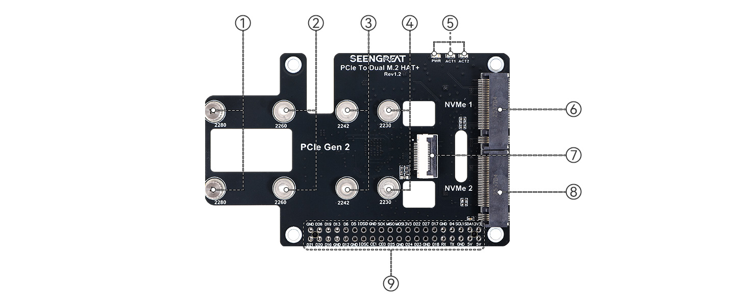 ⑤ Indicators: PWR (power), ACT1 (NVMe1 activity), ACT2 (NVMe2 activity)
