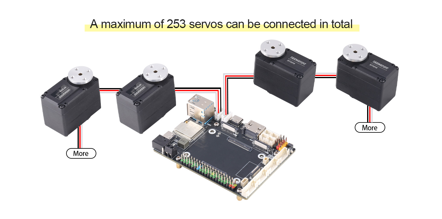 - Onboard two Serial bus servo control connectors, capable of controlling up to 253 bus servos and obtaining servo feedback.
