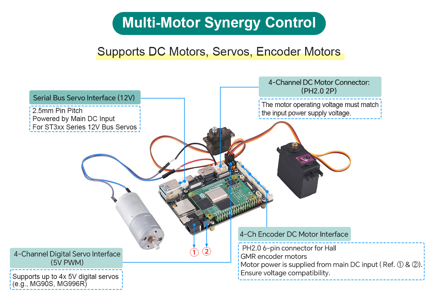 ⑲ 4-Channel DC Motor Connector with Encoder: PH2.0 1x6P, compatible with DC motors equipped with Hall encoders or GMR encoders. The motor drive signals are shared, and the motor voltage is supplied by the DC power input (see ① and ② in Figure 4-1). Users should pay attention to the power voltage when using DC motors;