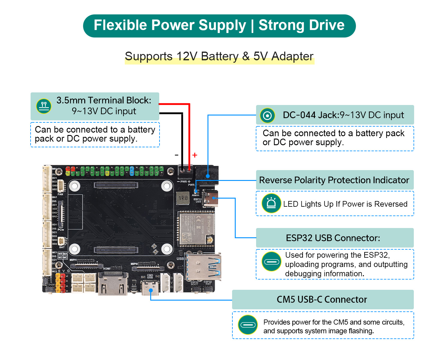 The board is equipped with 4 connectors serving as power input interfaces, namely the DC Power Input 3.5mm Terminal Block, DC Power Input DC-044 Jack , CM5 USB-C Connector , and ESP32 USB Connector .DC power can be input via either the 3.5mm terminal block or the DC-044 jack (only one connector needs to be connected). The voltage range is 9~13V, and this interface can withstand high power. The power supply directly powers serial bus servos and DC motors. It is recommended to select 12V-rated serial bus servos and DC motors to match the power supply specifications.