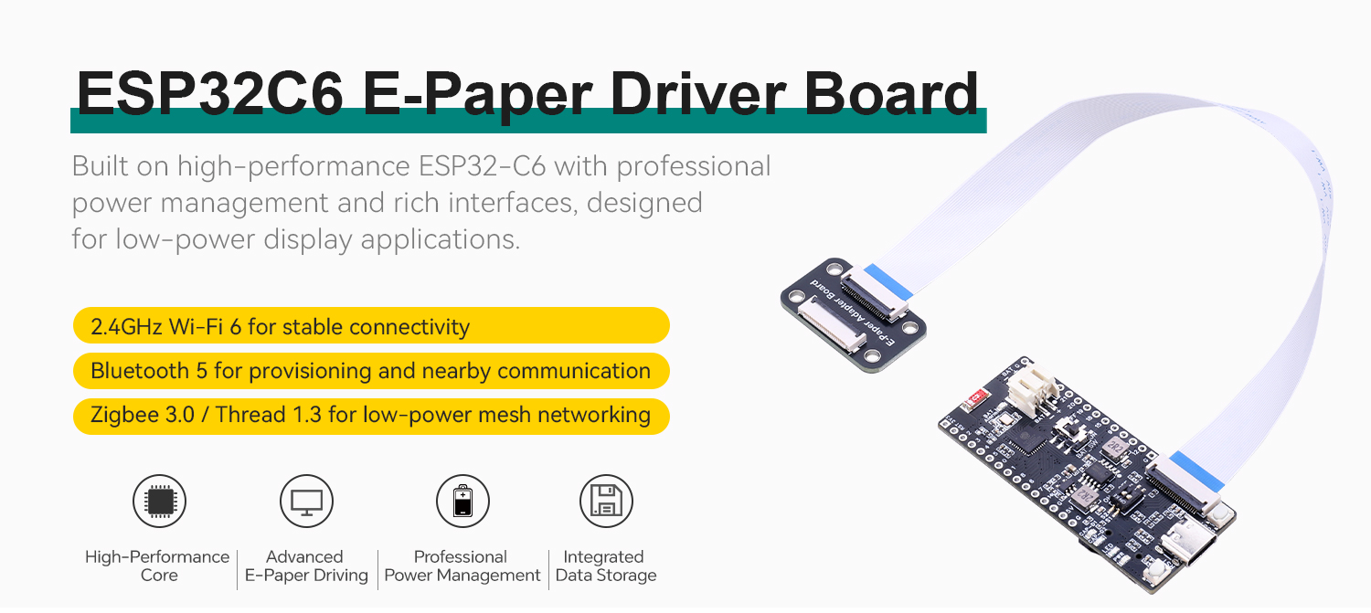This E-ink display driver board based on the ESP32-C6FH4 integrates a high-performance core and abundant peripherals, boasting comprehensive functions and flexible ease of use. It is onboard with the ETA9185 lithium battery charge-discharge chip for efficient lithium battery charging and discharging management; equipped with an SD card slot and a USB connector to meet the demands of data storage and communication; and features a 24P FPC connector that is highly compatible with multiple models of e-ink displays, delivering strong adaptability. It also fitted with a 2.4G ceramic antenna to support wireless communication; comes with BOOT and RST buttons to simplify debugging and reset operations; and has all GPIO pins fully exposed for convenient expansion of various peripherals. Suitable for low-power scenarios such as smart wearables, electronic price tags, and portable instruments, this driver board provides stable and reliable hardware support for the development of e-ink display applications.