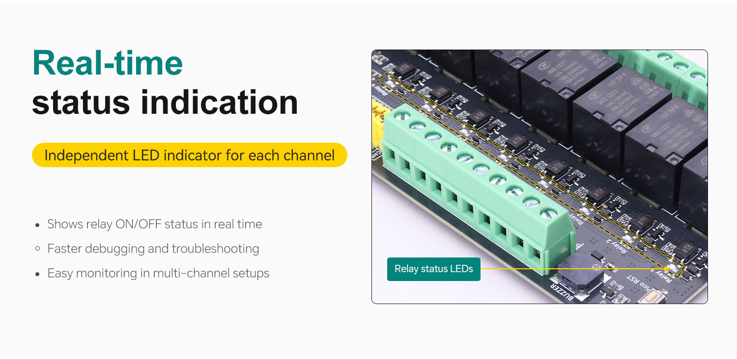 · Clear working status: each relay includes an LED status indicator for real-time visual feedback
