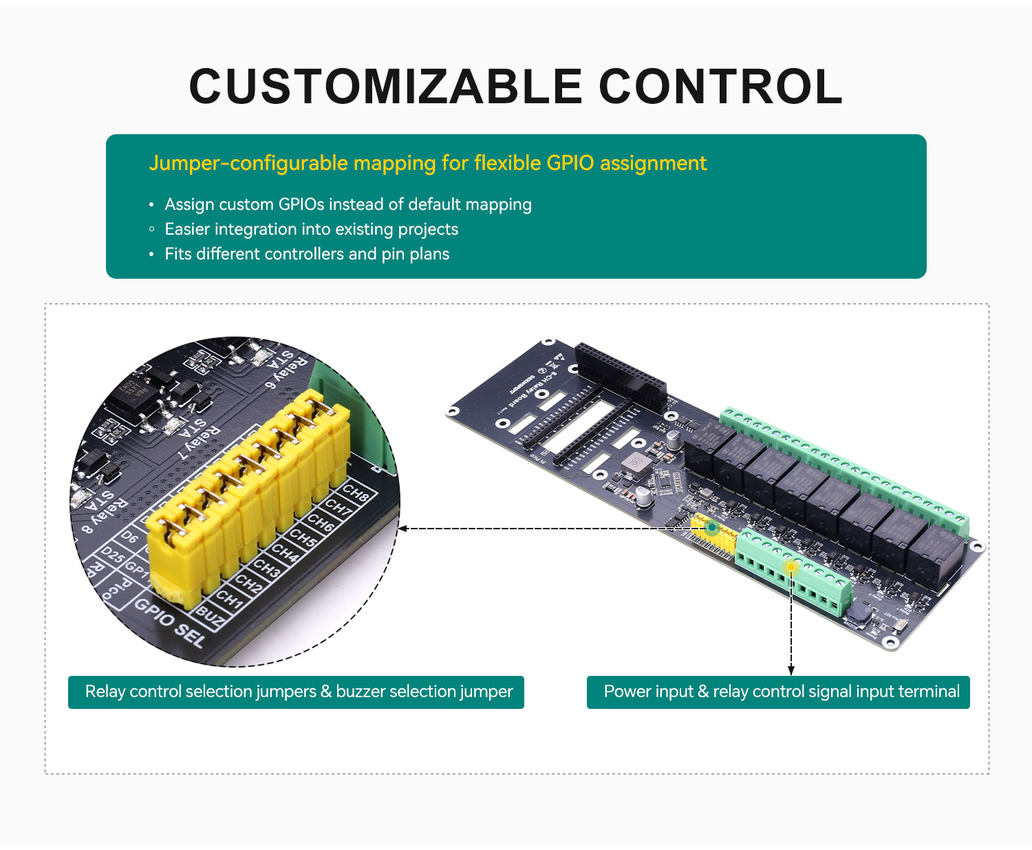 · Customizable control: relay control jumpers allow you to assign custom GPIO pins instead of fixed default settings