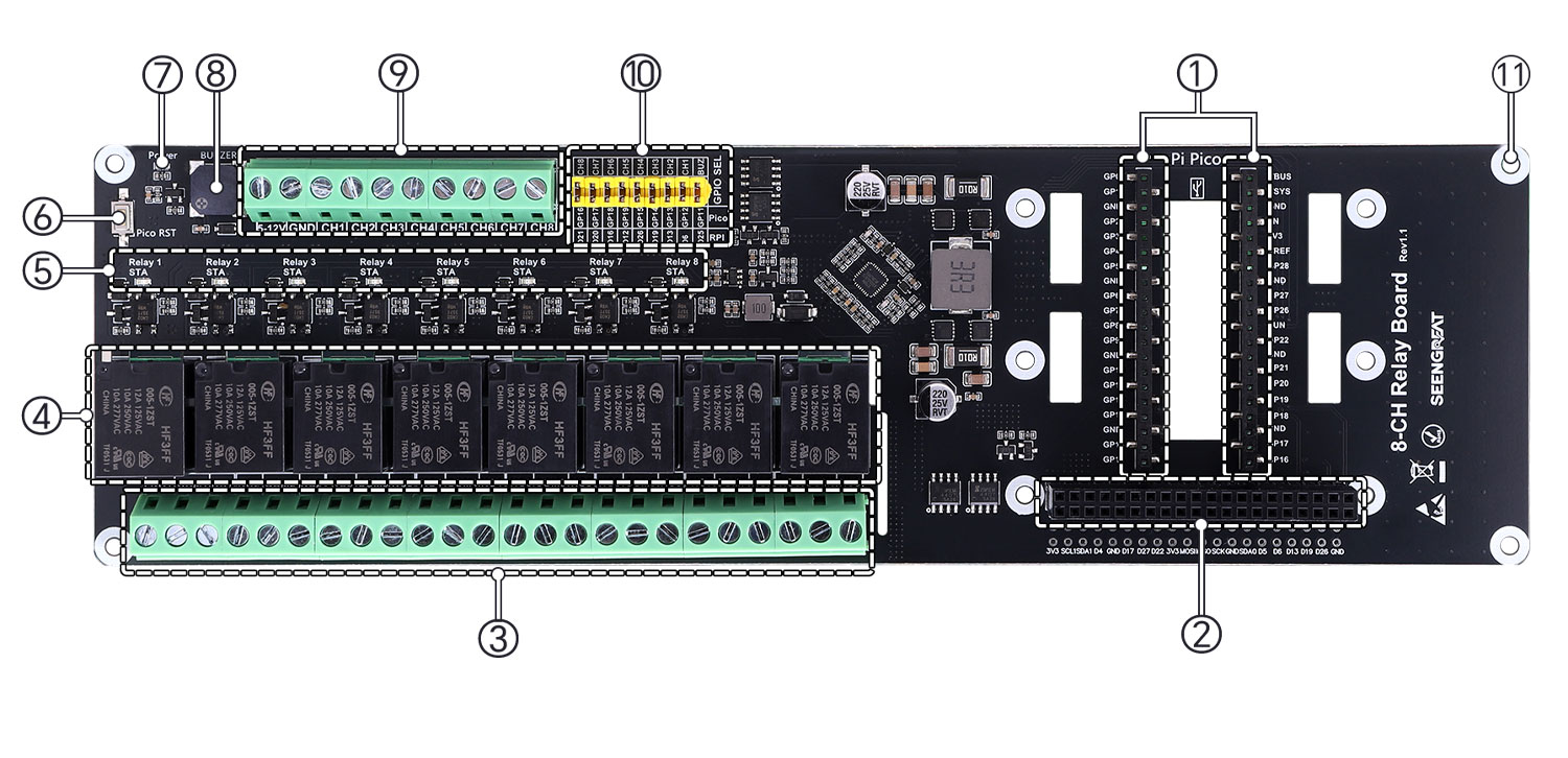 ⑩Relay control selection jumpers & buzzer selection jumper