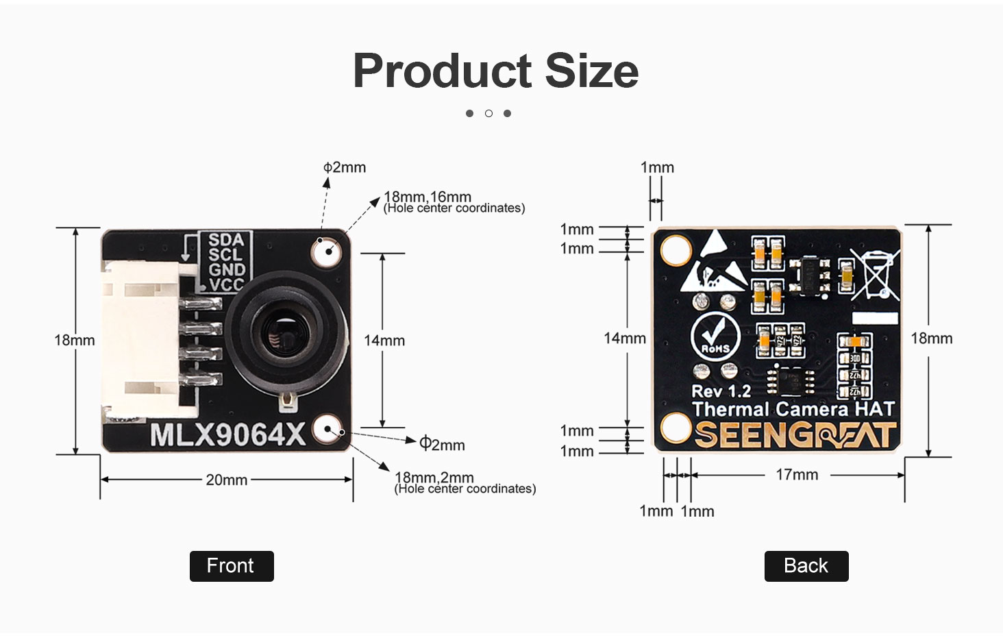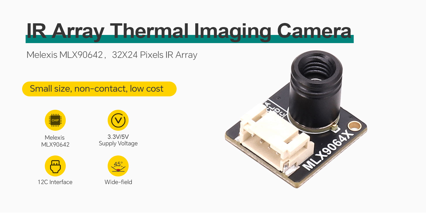 Thermal Camera MLX90642-D45 is a far-infrared thermal sensor array designed with Melexis MLX90642. With a resolution of 32x24, it provides great performance for applications that do not require high-resolution images or high frame rate, and provides a cost-effective alternative to more expensive high-end infrared thermal camera. Typical applications for the MLX90642 include fire protection systems, intelligent buildings, intelligent lighting, IP/surveillance cameras, HVAC equipment and vehicle seat occupancy detection.