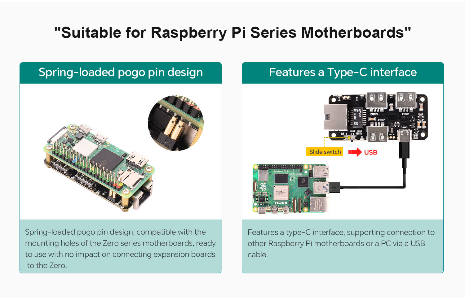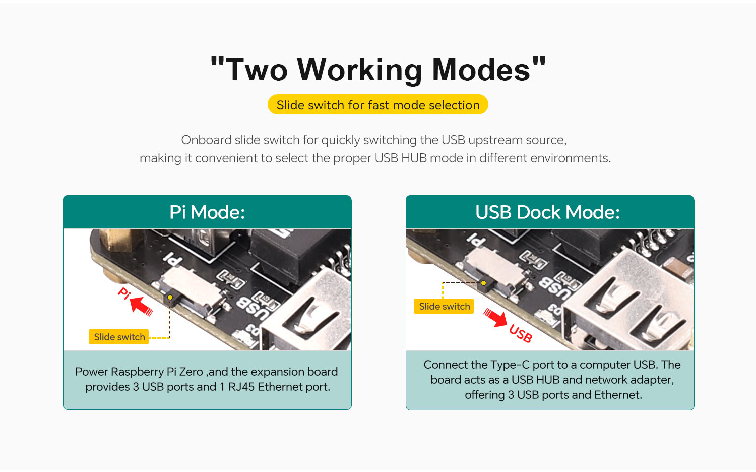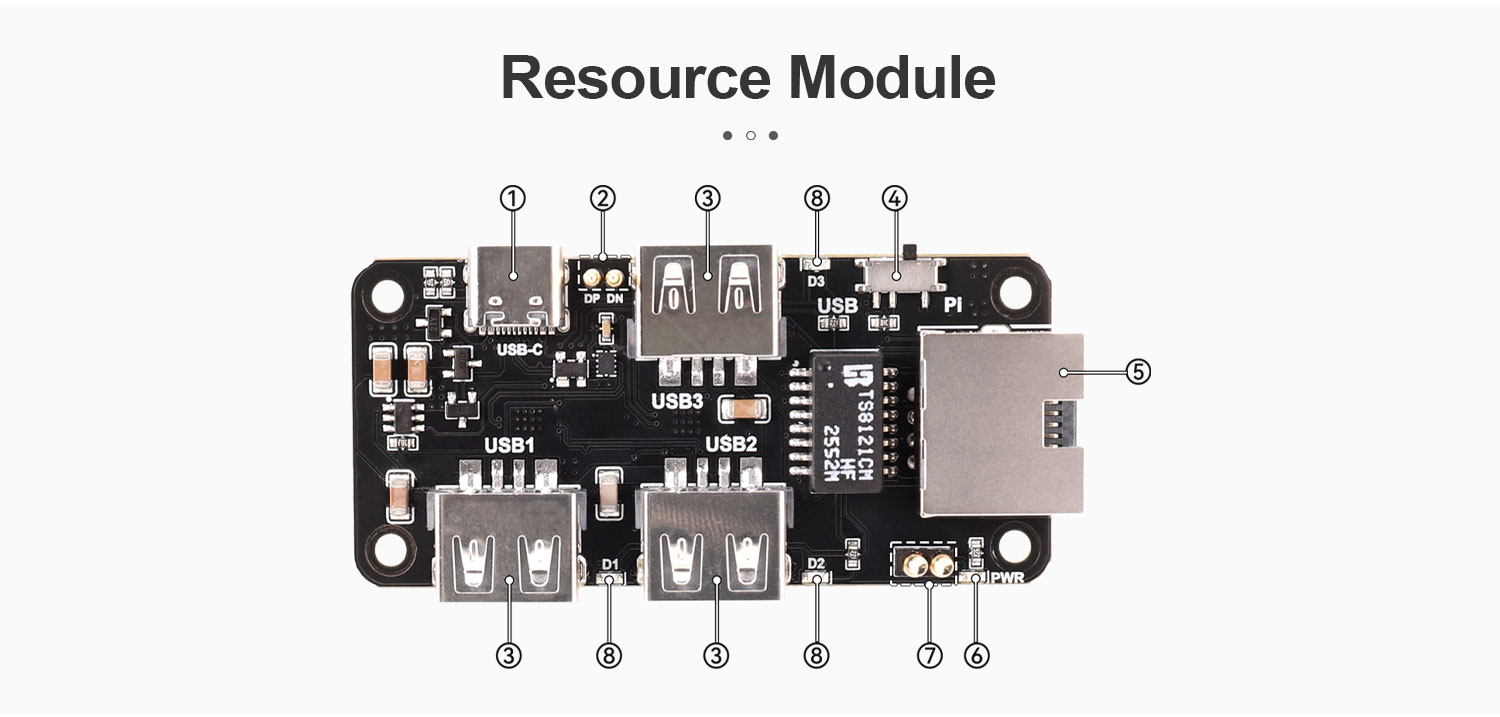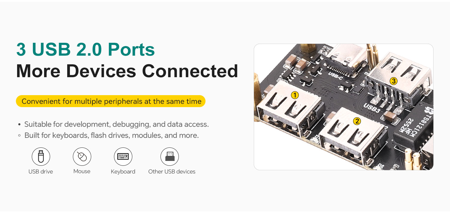 It integrates three USB 2.0 Type-A ports and one RJ45 Ethernet port, allowing convenient connection of peripheral devices and network equipment. The onboard slide switch lets users switch the USB upstream source as needed for greater flexibility. The Type-C port can either connect to a power adapter to power the Raspberry Pi Zero, or connect to a computer to provide USB expansion and USB-to-Ethernet functions.