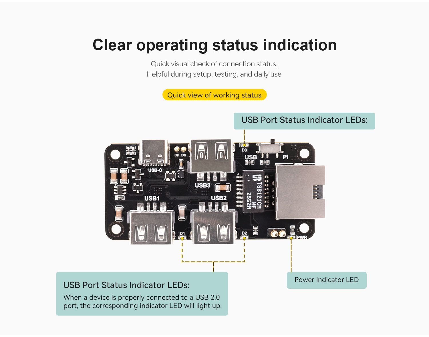 - Onboard 1 power LED and 3 USB status LEDs for clear operating status indication.