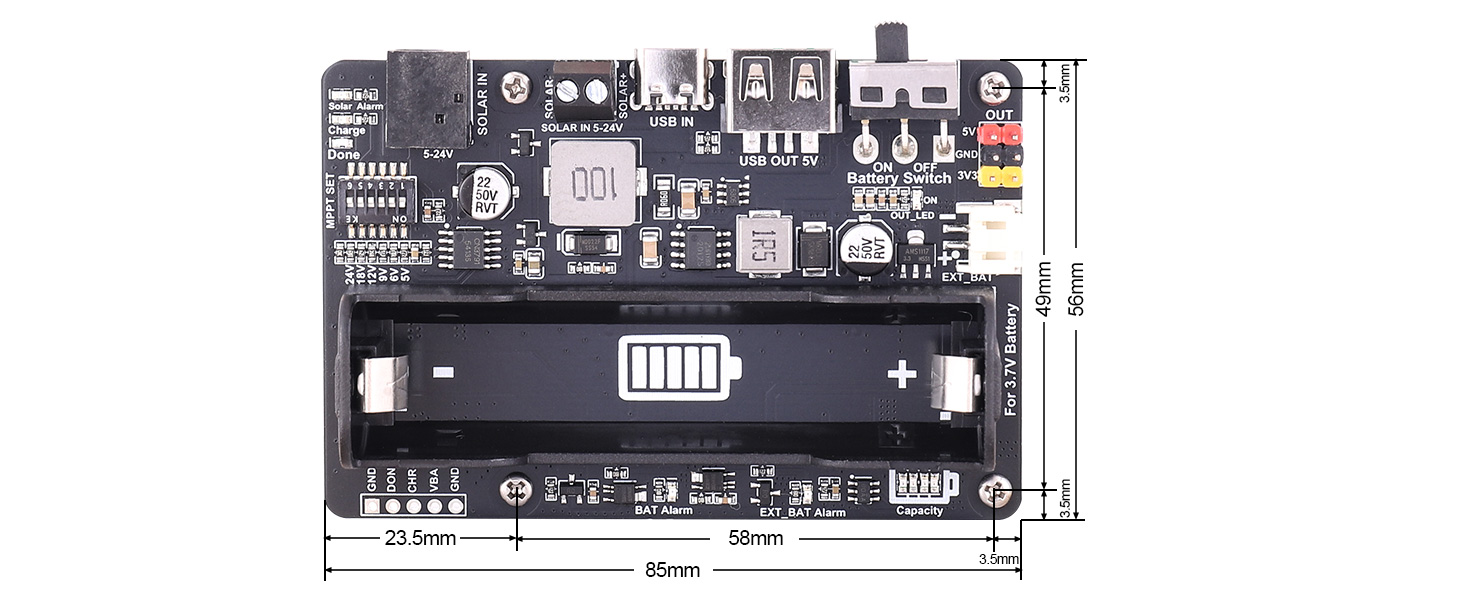 Solar Energy Manager is a solar power management module, which can charge the 3.7V 18650 lithium battery through solar panel or USB port.The module features MPPT (Maximum Power Point Tracking) and protection functions of battery charging and discharging. MPPT power point tracking can automatically adjust the charging power according to the input voltage, taking advantage of solar energy more efficiently. The protection circuit of charging and discharging can monitor the battery voltage in real time, preventing the battery from overcharging and over-discharging. It can protect the battery and prolong the battery life. Due to its excellent stability and efficient management of charging and discharging, it can be used in solar power generation, low-power IoT and other environmental protection projects.
