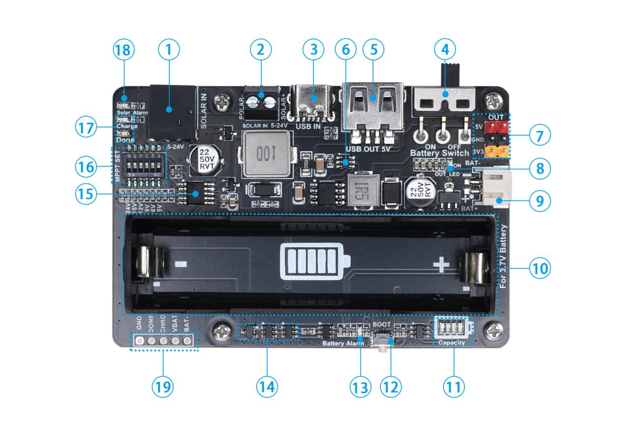 ⑮ CN3791 solar charging chip.