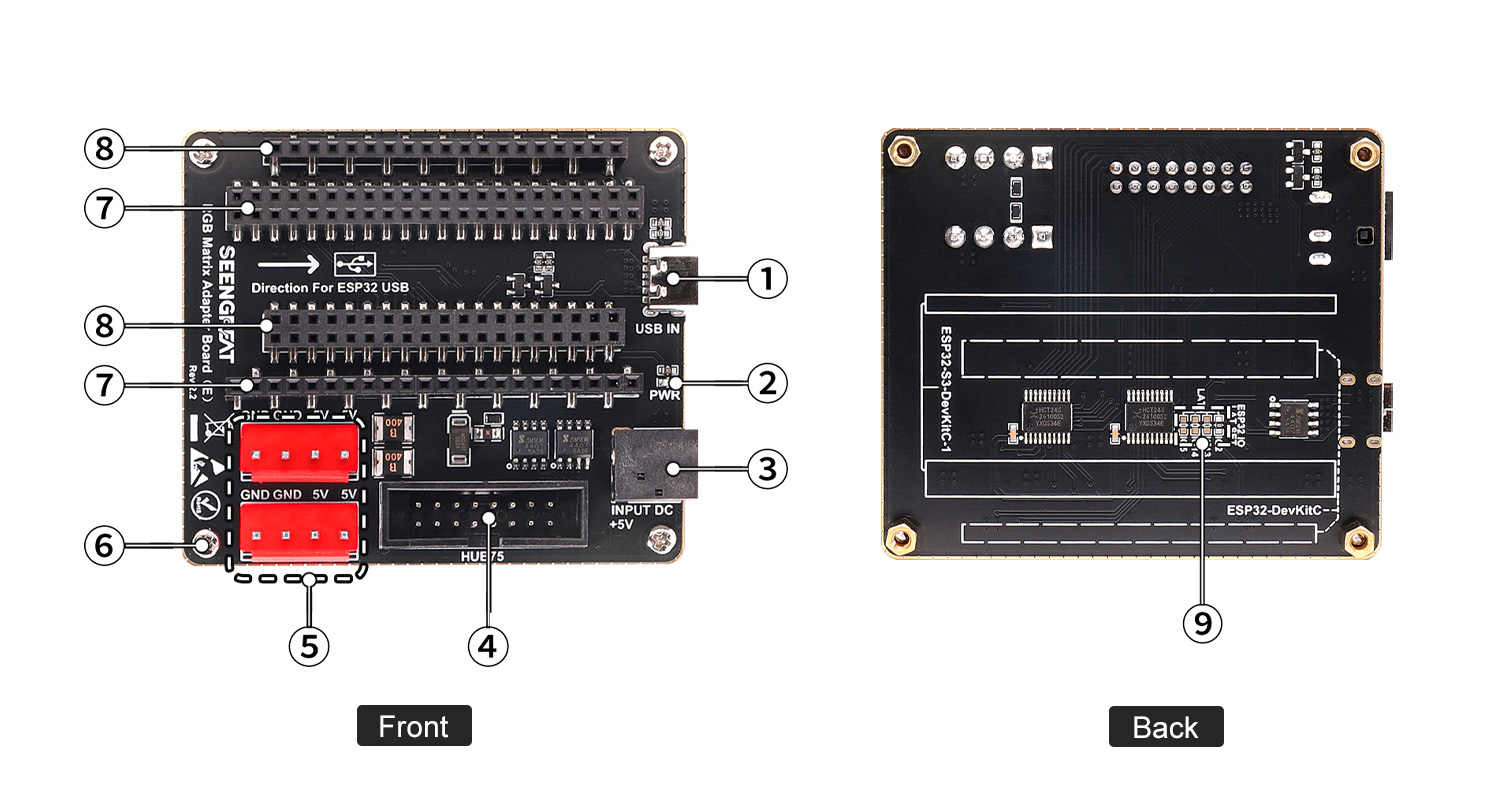 The RGB Matrix Adapter Board (E) is designed based on the ESP32-S3-DevKitC-1 and ESP32-DevKitC V4 development boards. It is specifically built for efficient data transmission and stable power management. This board is suitable for displaying text, graphics, animations, and more, helping users quickly bring various creative designs to life.