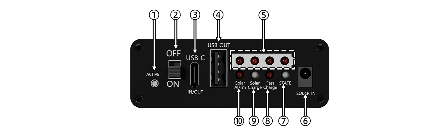 ⑨ Solar Charge: Indicator LED for solar charging status. Red indicates that solar charging is in progress, and green indicates that solar charging is fully charged.