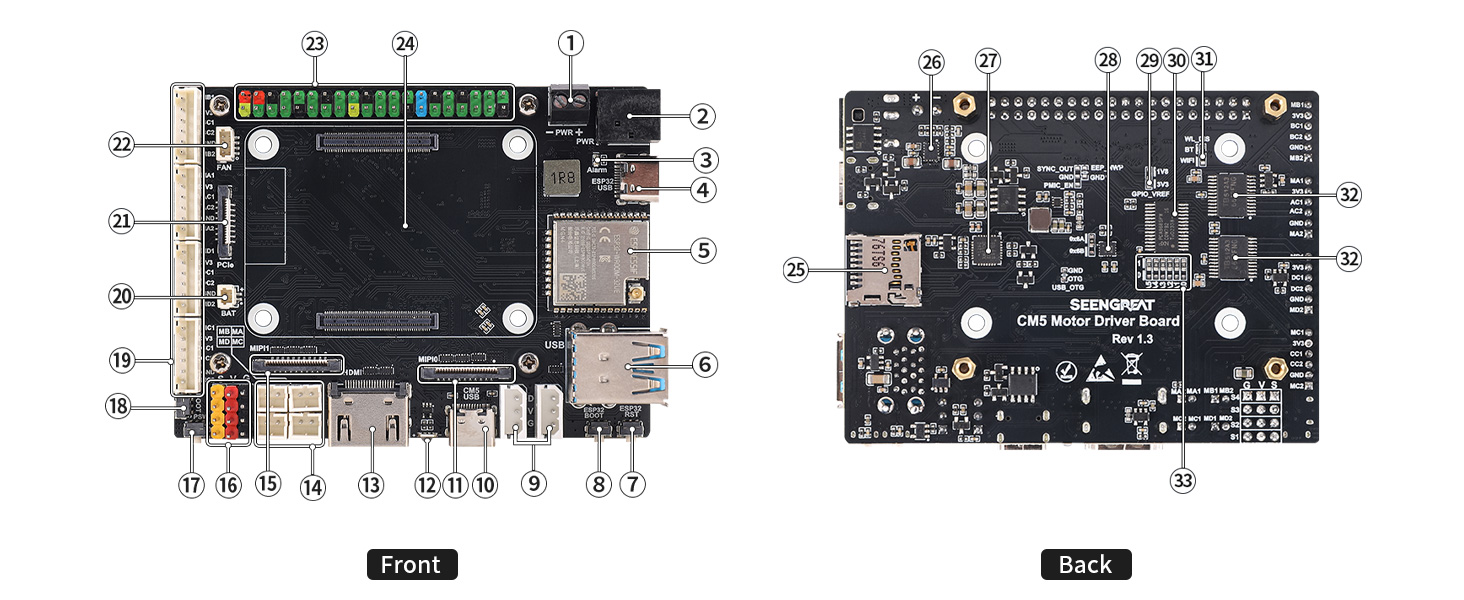 ⑱ CM5 BOOT Button: Press before power-on to force boot via USB for system image flashing (useful if the eMMC is damaged);