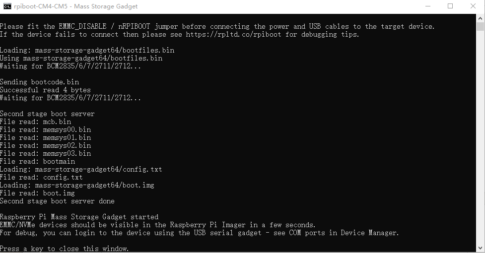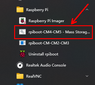 Next, run the rpiboot software (users may install it themselves; download link: https://raw.githubusercontent.com/raspberrypi/usbboot/master/win32/rpiboot_setup.exe), and launch rpiboot-CM4-CM5 – Mass Storage Gadget.