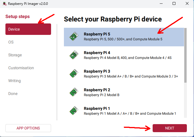 After the above information appears, run the Raspberry Pi Imager software (it is recommended to install a newer version; download link: https://www.raspberrypi.com/software/). In the "Device" field, select "Raspberry Pi 5", then click "Next".