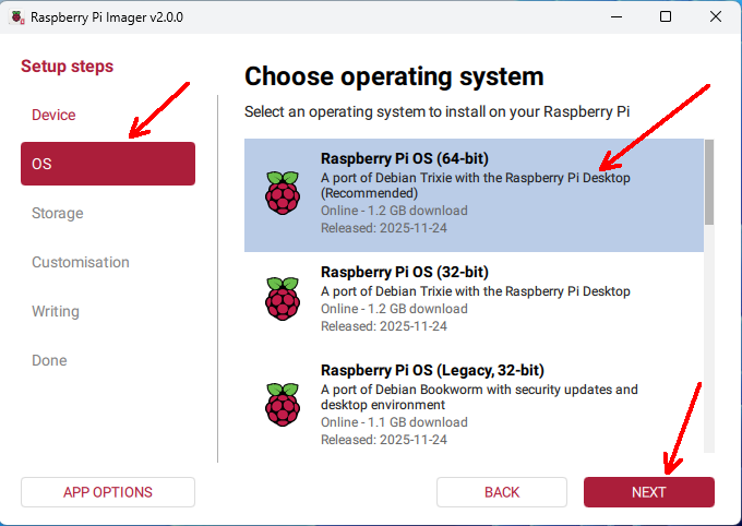 In the "OS" field, select an appropriate operating system, such as "Raspberry Pi OS (64-bit)", then click "Next".