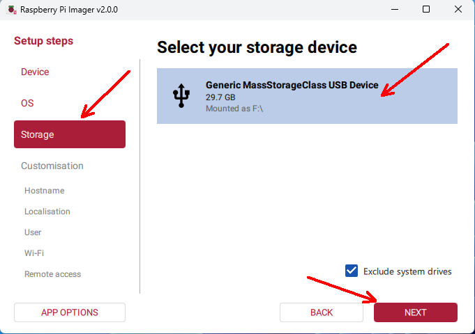 In the "Storage" field, select your image storage device, such as the SD card or the Compute Module eMMC, then click "Next".