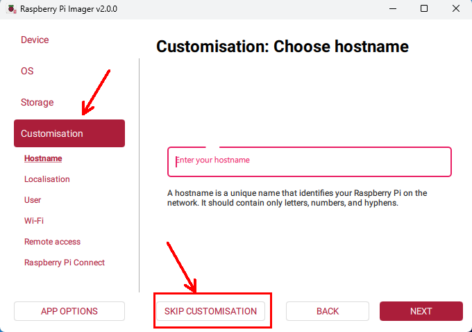 In the "Customization" step, you can select "SKIP CUSTOMIZATION" to proceed without configuring the system, or you may configure the system according to the on-screen prompts.