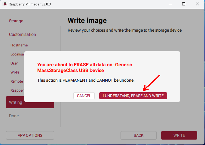 Click "I UNDERSTAND, ERASE AND WRITE".