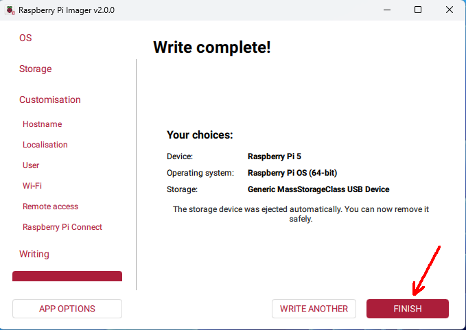 Wait patiently for the writing and verification process to complete, then click "FINISH".