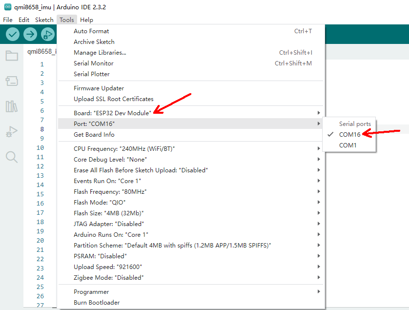 Open /demo-codes/sg/qmi8658_imu/qmi8658_imu.ino using Arduino IDE. Use a USB-C cable to connect the computer to the ESP32 USB connector (see ④ in Figure 4-1). Then select ESP32 Dev Module under Tools → Board → esp32, and select the detected ESP32 port under Tools → Port, as shown in the figure below: