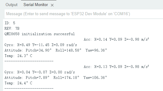 Click the "Upload" button in the upper-left corner to upload the code to the ESP32. Then click Tools → Serial Monitor to open the window and view the sensor data output, as shown in Figure 4-15.
