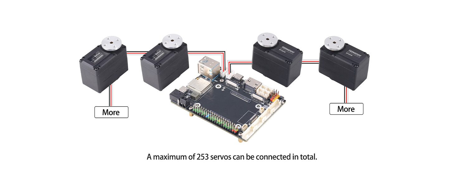 - Onboard two Serial bus servo control connectors, capable of controlling up to 253 bus servos and obtaining servo feedback.