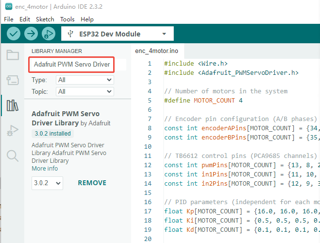 Open the project file /demo-codes/sg/enc_4motor/enc_4motor.ino. Then go to Tools → Manage Libraries..., enter Adafruit PWM Servo Driver in the search box, and click "INSTALL" to install it, as shown in Figure 4-18.