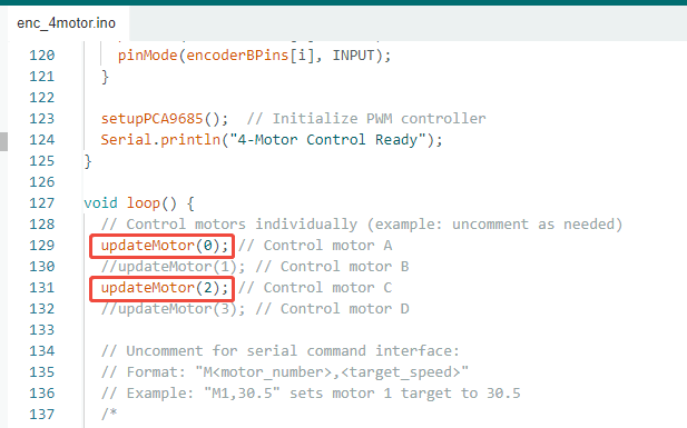 Figure 4-18By default, this code connects motors with GMR encoders to the MAx (2.0 mm 1×6P) and MBx (2.0 mm 1×6P) connectors, but only MAx is actually enabled. Motors with Hall encoders are connected to the MCx (2.0 mm 1×6P) and MDx (2.0 mm 1×6P) connectors, but only MCx is actually enabled. As shown in the code in Figure 4-19, users can modify the code according to their actual requirements.