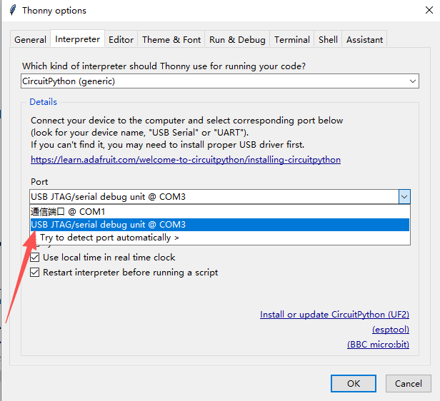 4. Open Thonny -> Run -> Configure Interpreter. Select CircuitPython (generic) and choose the connected serial port.