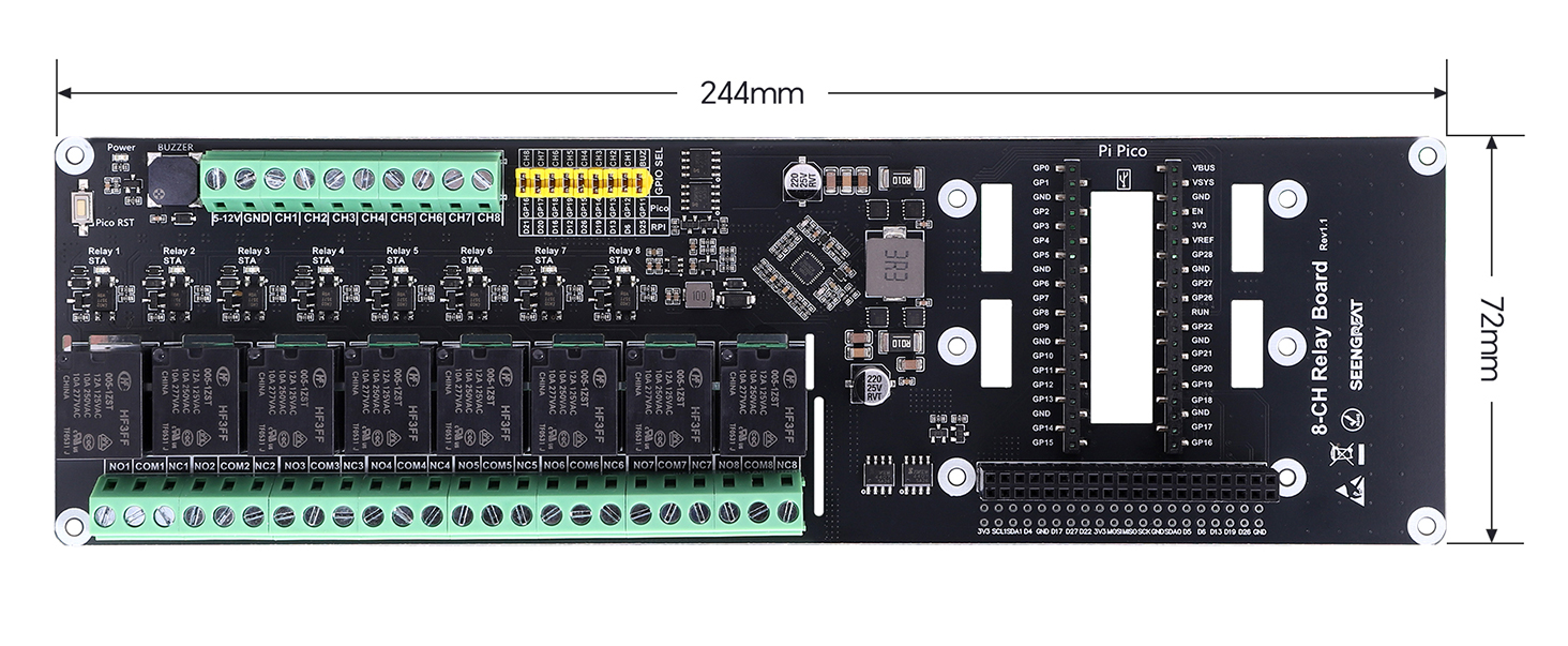This 8-channel relay expansion board is designed for the Raspberry Pi / Raspberry Pi Pico series. It includes a Raspberry Pi 40-pin GPIO header, making it compatible with Raspberry Pi mainboards and suitable for a wide range of Raspberry Pi platforms.