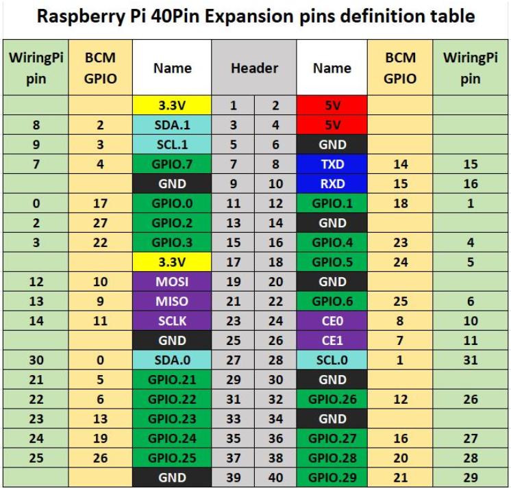 ② Raspberry Pi 40-pin GPIO extension header (WiringPi numbering silkscreen)